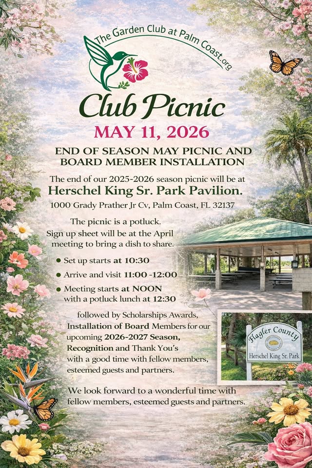 Garden Club Members and Friends. May 11th is our annual club picnic. Bring a dish to share. We have a spectacular line up for scholarship awards, board induction, lots of thank you’s to go around.